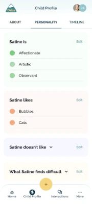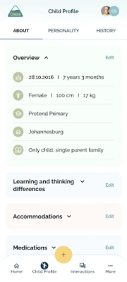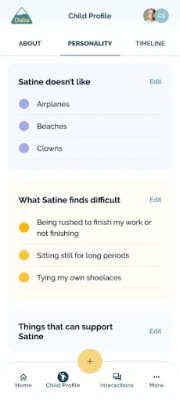 Dalza's holistic child view captures the child's unique personality, interests, strengths, challenges, and development. Information about milestones, life events, diagnoses, assessments, therapy, education, and support further builds the child profile as a cohesive, living framework through each developmental stage.