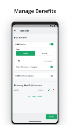 - Benefits Management: Manage PTO like Vacation and Sick/Medical leave. Calculate withholdings and contributions for benefits such as Cafeteria plans (Section 125), Retirement plans, Savings accounts, etc.