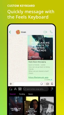 Tap the Keyboard Icon to toggle between your regular keyboard and the Feels Music Messaging keyboard to send Music Messages.