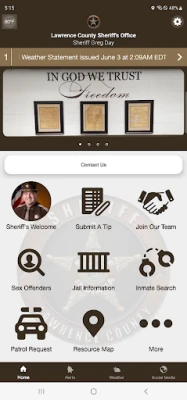 The Lawrence County Sheriff’s Office mobile application is an interactive app developed to improve communication with area residents. The Lawrence County Sheriff’s Office app allows residents to connect with the Office of Sheriff by making patrol requests, submitting tips, and other interactive features, as well as providing the community the latest public safety news and information. The app is another public outreach effort developed by the Lawrence County Sheriff’s Office to improve communication with county residents and visitors. This app is not intended to be used to report emergency situations. Please call 911 in an emergency.
