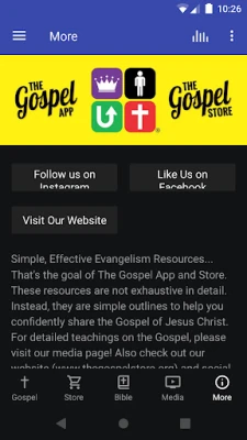 Simple, Effective Evangelism Resources... That's the goal of The Gospel App and The Gospel Store. This resource is a simple outline to help you confidently share the Gospel of Jesus Christ. The app also includes detailed teachings on the Gospel and Evangelism on the Media Page. Visit www.thegospelstore.org for more details.